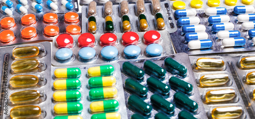 Blister background with multicolored pills and tablets. Pharmaceuticals, antibiotics. Medical concept