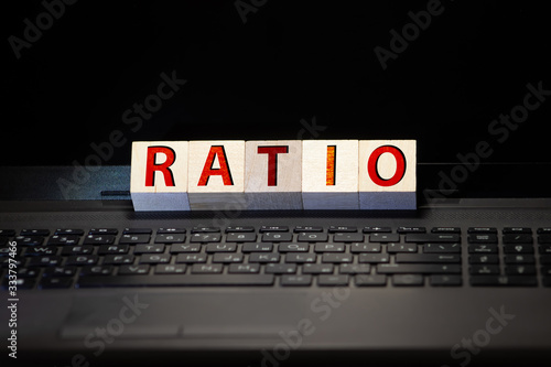 Block of alphabet letters forming the word RATIO on wooden surface.