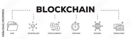 Blockchain icon infographic illustration concept with icon of data, decentralized, crypto currency, timestamp, network and transactions icon live stroke and easy to edit