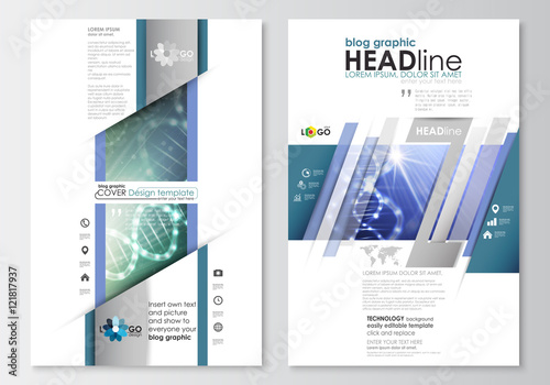 Blog graphic business templates. Page website design template, easy editable, abstract flat layout. DNA molecule structure, science background. Scientific research, medical technology