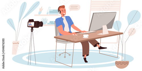 Blogging concept in flat design. Blogger plays games and streaming in blog. Gamer playing at computer and recording at camera. Video content creation, social network people scene.