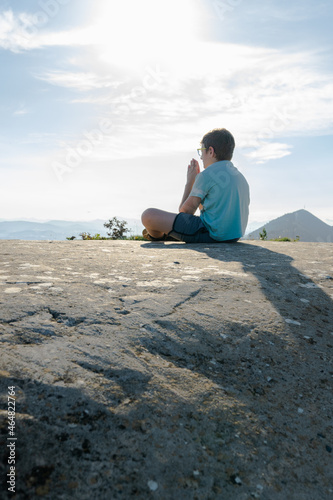 blond boy sitting on a rock on the mountain, meditating with his hands together.
