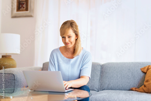 Blond haired woman sitting at home and using laptop for work