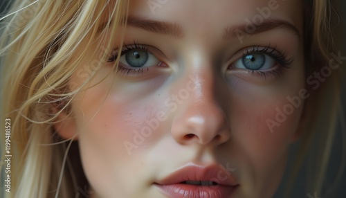 Blond Woman's Face: Soft Light, Dreamy Gaze, Realistic Portrait