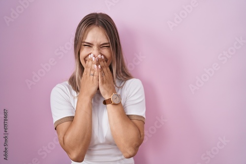 Blonde caucasian woman standing over pink background laughing and embarrassed giggle covering mouth with hands, gossip and scandal concept