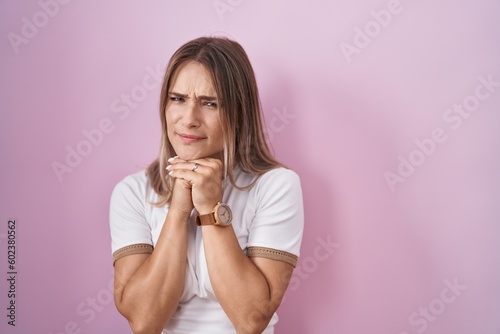 Blonde caucasian woman standing over pink background laughing nervous and excited with hands on chin looking to the side