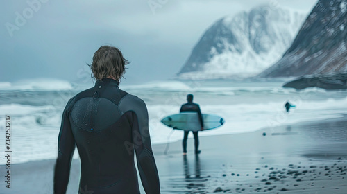 Blonde Male Surfer in Winter Wetsuit at Unstad Beach, Norway