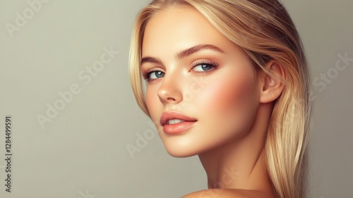 Blonde model with shiny, sleek hair and perfect complexion, posed elegantly on a neutral gray background