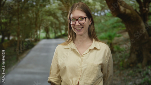 Blonde woman wearing glasses smiles while standing on forest path under filtered green sunlight; serenity.
