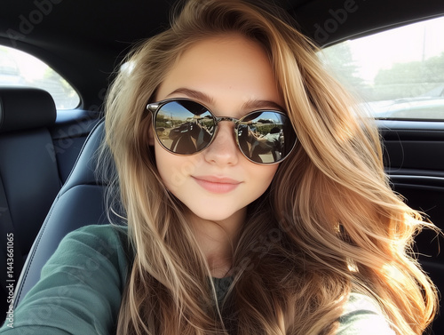 Blonde woman wearing sunglasses is sitting in car and smiling