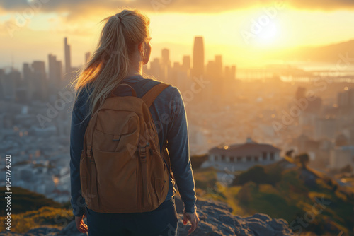 Blonde woman with backpack enjoying sunset over vibrant city skyline
