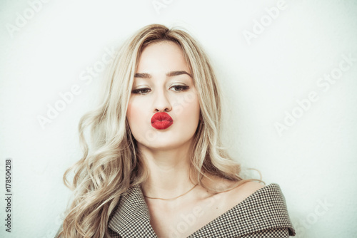 Blonde woman with long hair standing against white wall making face expressions