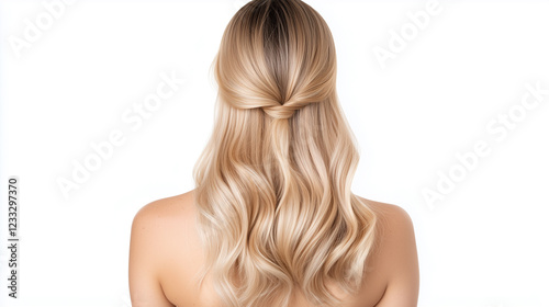 Blonde woman with long wavy hair styled elegantly in a half-up twist against a white background.