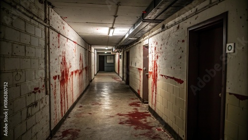 Blood drips down a dimly lit grunge hallway, grunge, blood, weathered, industrial, horror