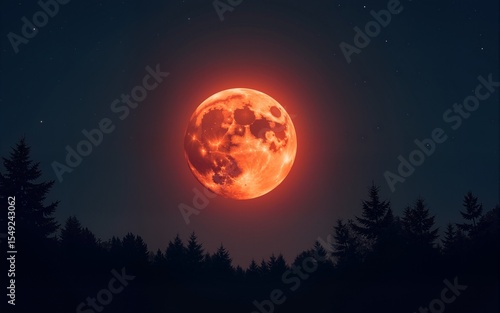 Blood Moon during lunar eclipse over silhouetted trees and starry sky suitable for science presentations, nature themes, or dramatic backgrounds. High quality