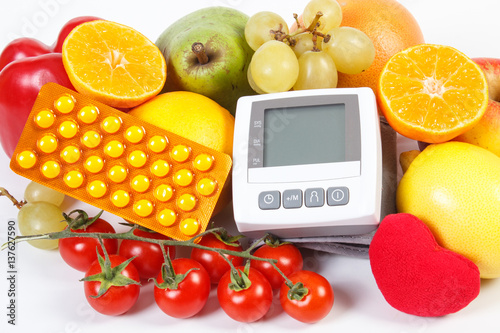 Blood pressure monitor, fruits with vegetables and medical pills, healthy lifestyle