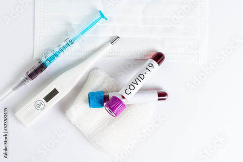 Blood sample in vacuum tube isolated with syringe, mask and thermometer. top view. COVID-19.