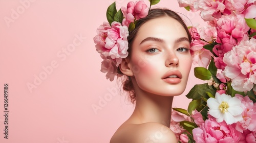 Blooming Beauty: A captivating portrait of a young woman with flawless skin, adorned with delicate pink blossoms, radiating a natural and ethereal beauty against a soft pink background.
