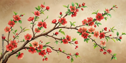 Blooming Cherry Branch on Watercolor Background, Cherry Blossom, Spring Flowers, Japanese Art