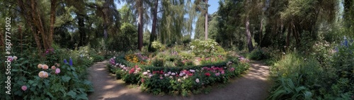 Blooming floral garden scene serene nature retreat panoramic view vibrant colors peaceful environment