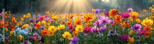 Blooming flowers in meadow with glowing paradise dreamlike nature concept. Vibrant flower field illuminated by soft sunlight in spring.
