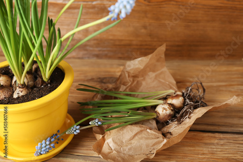 Blooming grape hyacinth plants (Muscari) on wooden background