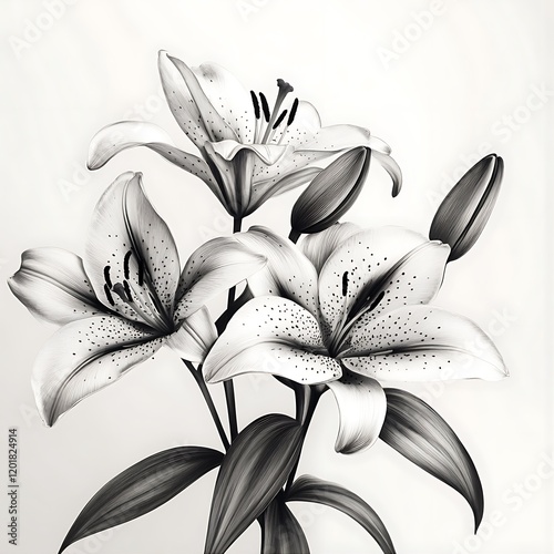 Blooming Lilies in Black and White Artistic Rendering with Realistic Detail and Open Petals