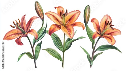 Blooming Lilies with Buds, Isolated Clean White Background