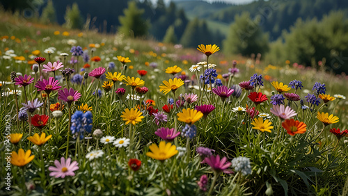 Blooming mountain meadow adorned with colorful flowers in a serene alpine setting