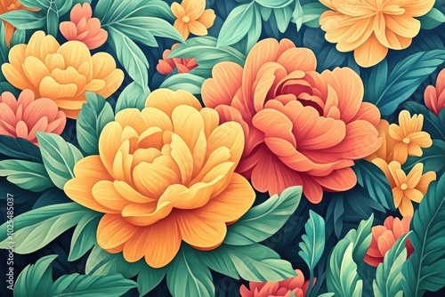 Blooming orange apricot Geum Mai Tai flower featuring semi-double petals in a summer garden, set against a vibrant floral background