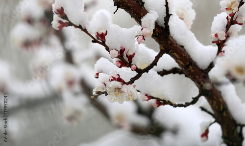 Blooming peach blossoms in the park after the snow
