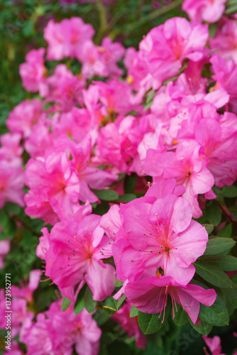 Blooming pink japan Azalea Ericaceae bush, Geisha Purple, rhododendron flower macro, background. Evergreen decorative plant outdoor or in orangery in botanical garden. Gardeining, plant breeding