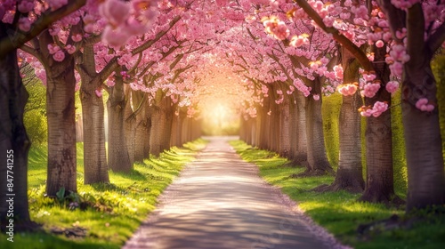 Blooming sakura alley scenic park with rows of pink cherry blossom trees in spring
