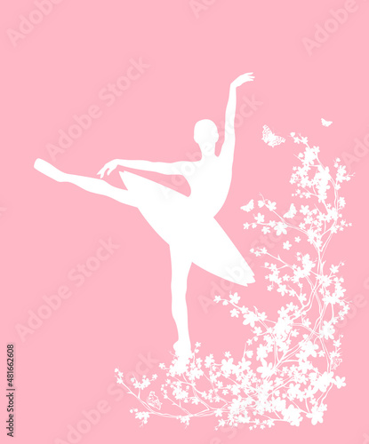 blooming spring season tree branches, slim ballerina girl and flying butterflies vector silhouette copy space design for classical ballet dance concept