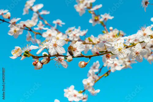 Blooming tree branch, cherry plum blossoms on a background of blue sky