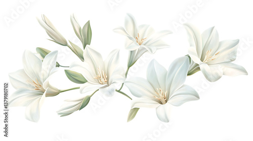 Blooming tuberose flowers with delicate white petals on a white background. A beautiful botanical element ideal for floral decor and greeting card designs.