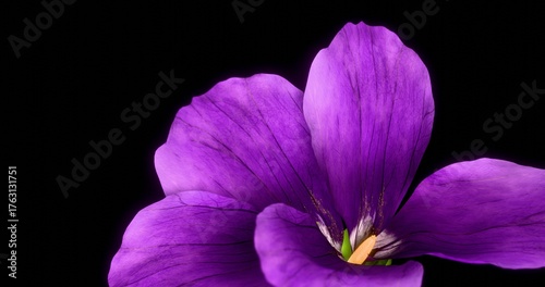 Blooming violet. Growing blossom from bud to big flower on black background. Macro view. 3D rendering.
