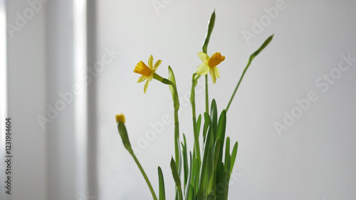 Blooming yellow Daffodil Narcissus Jonquil at home. Spring potted flowering plant. Easter concept