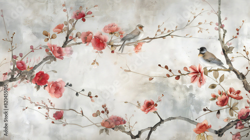 Blossom Chinoisserie Mural Silver Wallpaper, Watercolor background, birds, Tropical plant,
