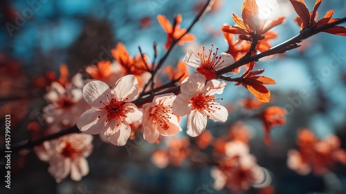 Blossoming apricot tree branches beneath beautiful sky with sunlight concept. Beautiful cherry blossom branch with vibrant pink flowers in bloom.