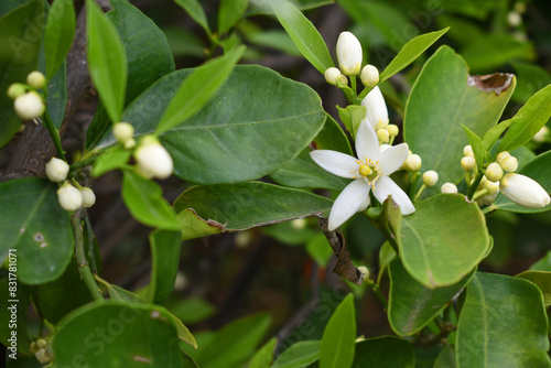 Blossoming orange tree flowers, orange blossoms, Spring harvest, closeup of Orange tree branches with flowers, buds and leaves, Chakwal, Punjab, Pakistan