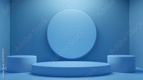 Blue abstract background with 3D scene rendering featuring a mock up podium display for product presentation