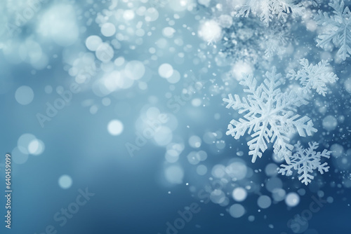 Blue abstract Christmas snowflakes decorated background, frame, copyspace. Generative AI