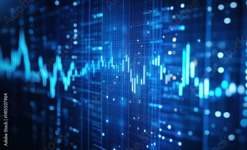 Blue abstract data visualization with lines grids and dots on a dark background.
