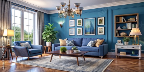 Blue and Beige Living Room with a Chandelier, a Rug, and a Shelf of Books, Interior Design, Home Decor, Living Room Design
