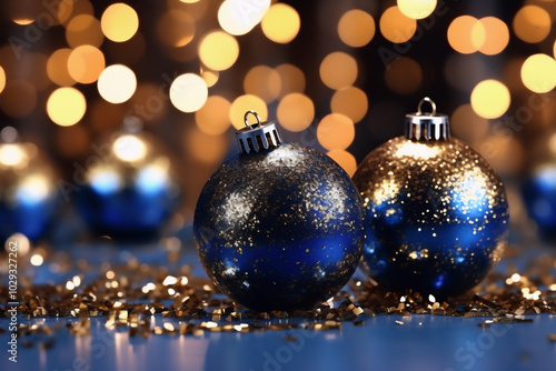 Blue and gold glitter christmas with abstract gold bokeh