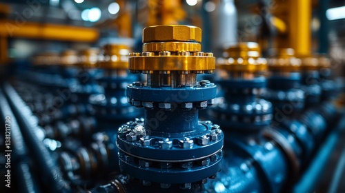 Blue and gold valves connected by complex fittings form industrial array