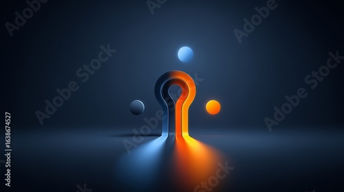 Blue and orange light bulb with three balls on top of it. The light bulb is a symbol of knowledge