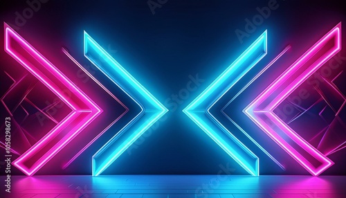 Blue and pink neon arrows, pointing opposite directions on a glossy stage, perfect for sleek, futuristic backgrounds and digital art