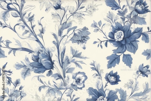 Blue and White Floral Seamless Pattern on Light Beige Background with Delicate Layers and Intricate Design